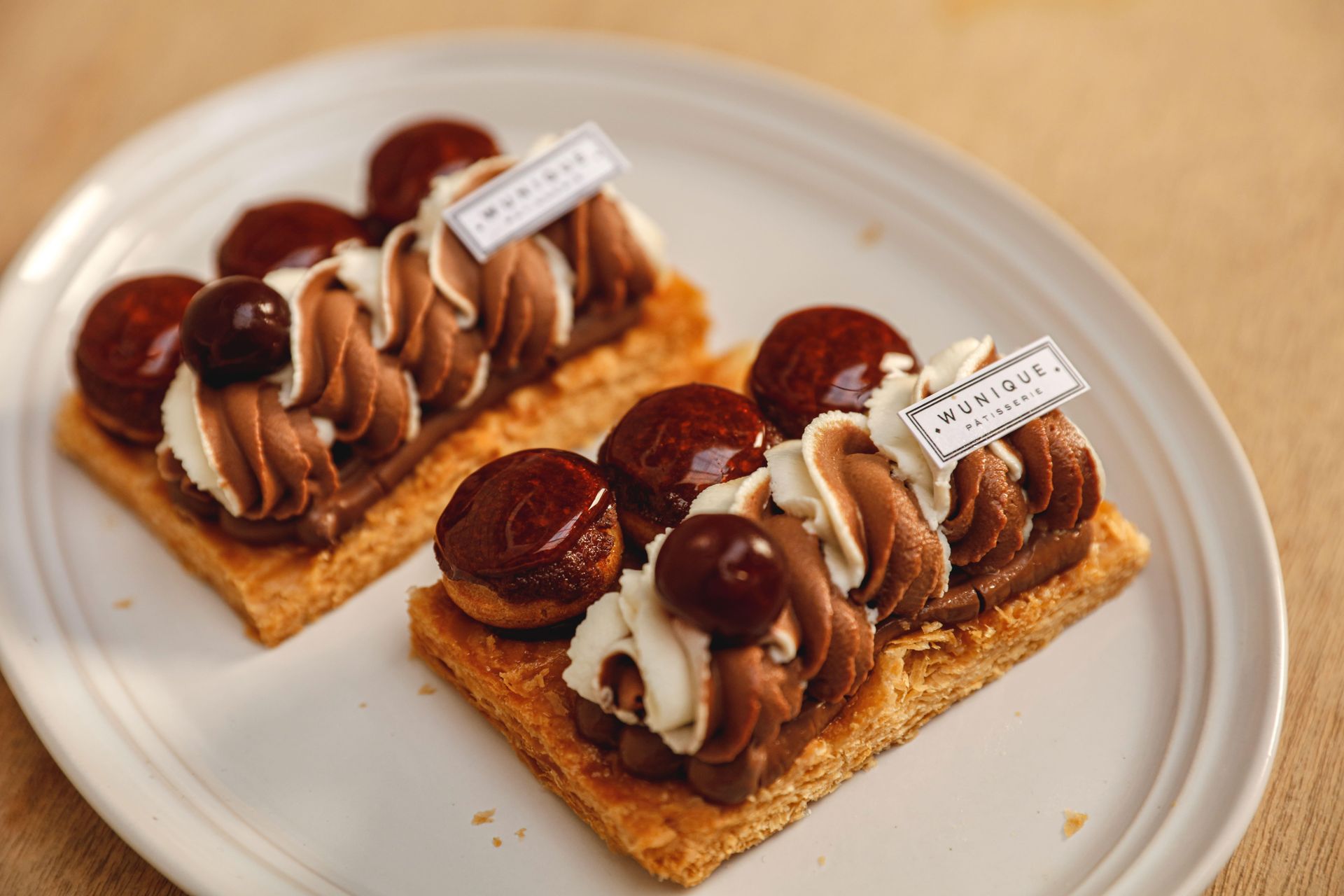 -層次介紹:黑糖泡芙X千層派皮X雙色抹茶香草鮮奶油X抹茶卡士達X巧克力甘納許