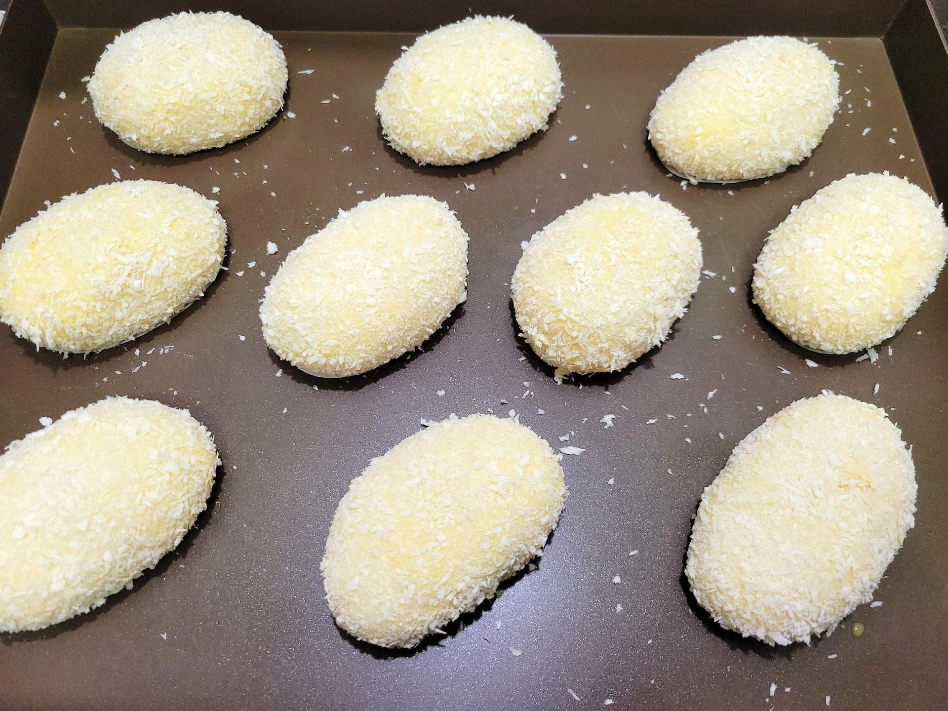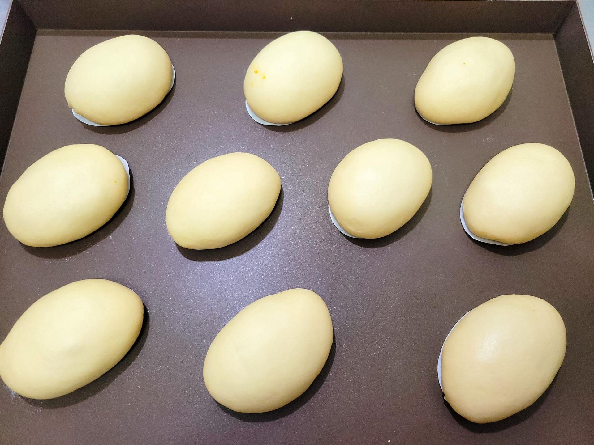 冷藏後的麵團柔軟好操作,分割滾圓後包入熟成咖哩餡,再次醒麵。醒發後輕滾上蛋液,沾裹上麵包粉,進行最後發酵。
