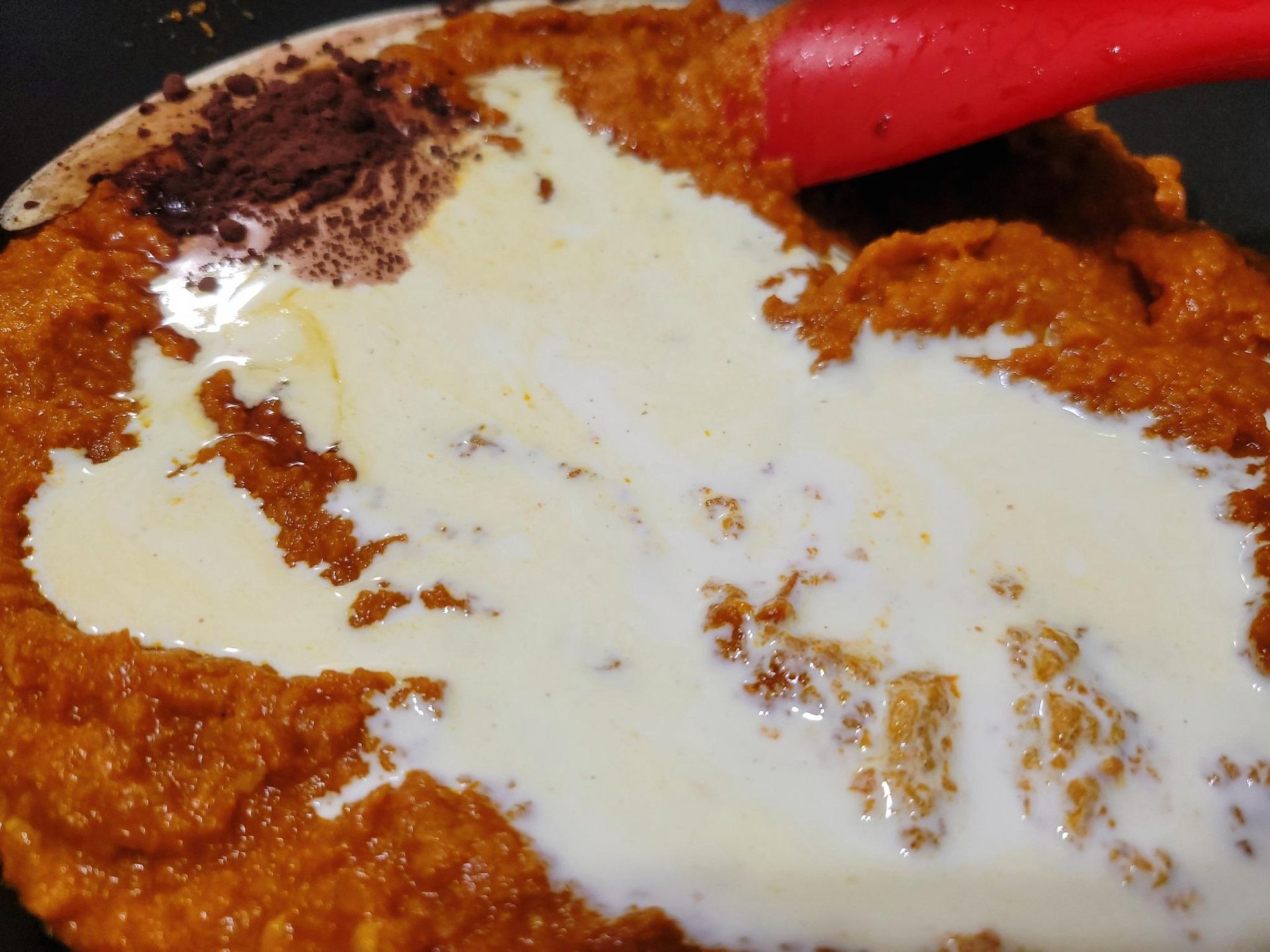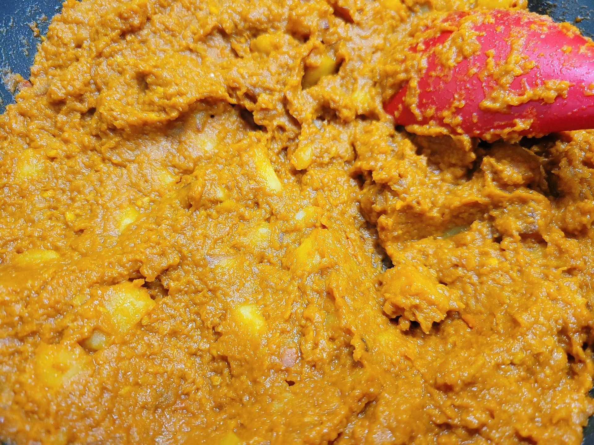 照著蜉蝣麵粉工作室阿偉老師線上課程中的教學,從炒蔬菜開始,一樣樣下鍋,依序加入各種調味料,最特別的是——老師連營業用的咖哩粉配方都毫不藏私地公開。我和老公為了調配這款咖哩粉,跑了好幾家中藥行,差點直奔迪化街。