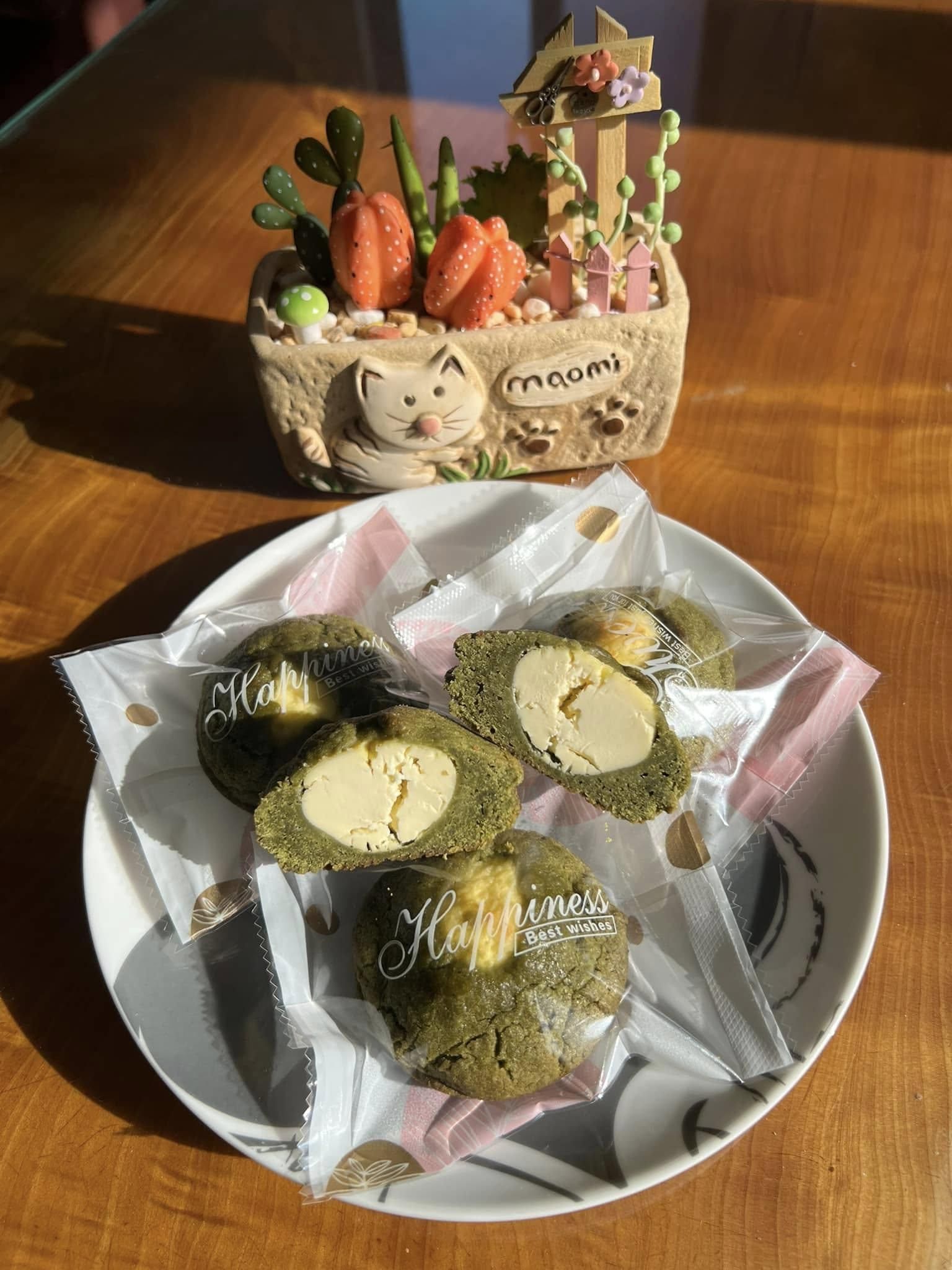 其實我以前不是特別愛吃抹茶口味的餅乾,但今天品嚐到雙重組合的味道,真的有驚豔到,加了乳酪起司,吃起來很清爽,不會甜膩⋯⋯