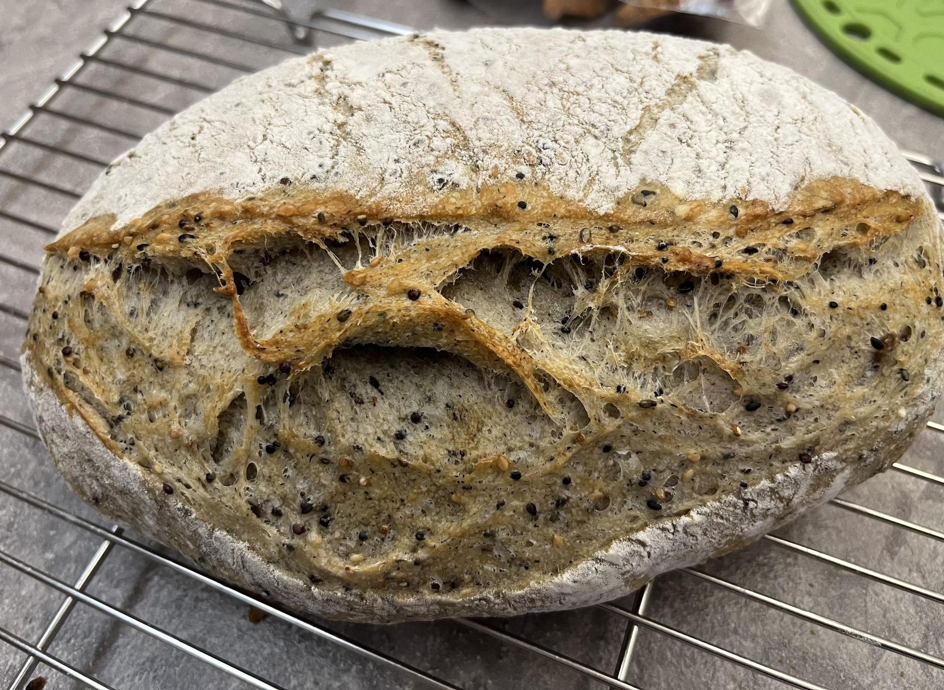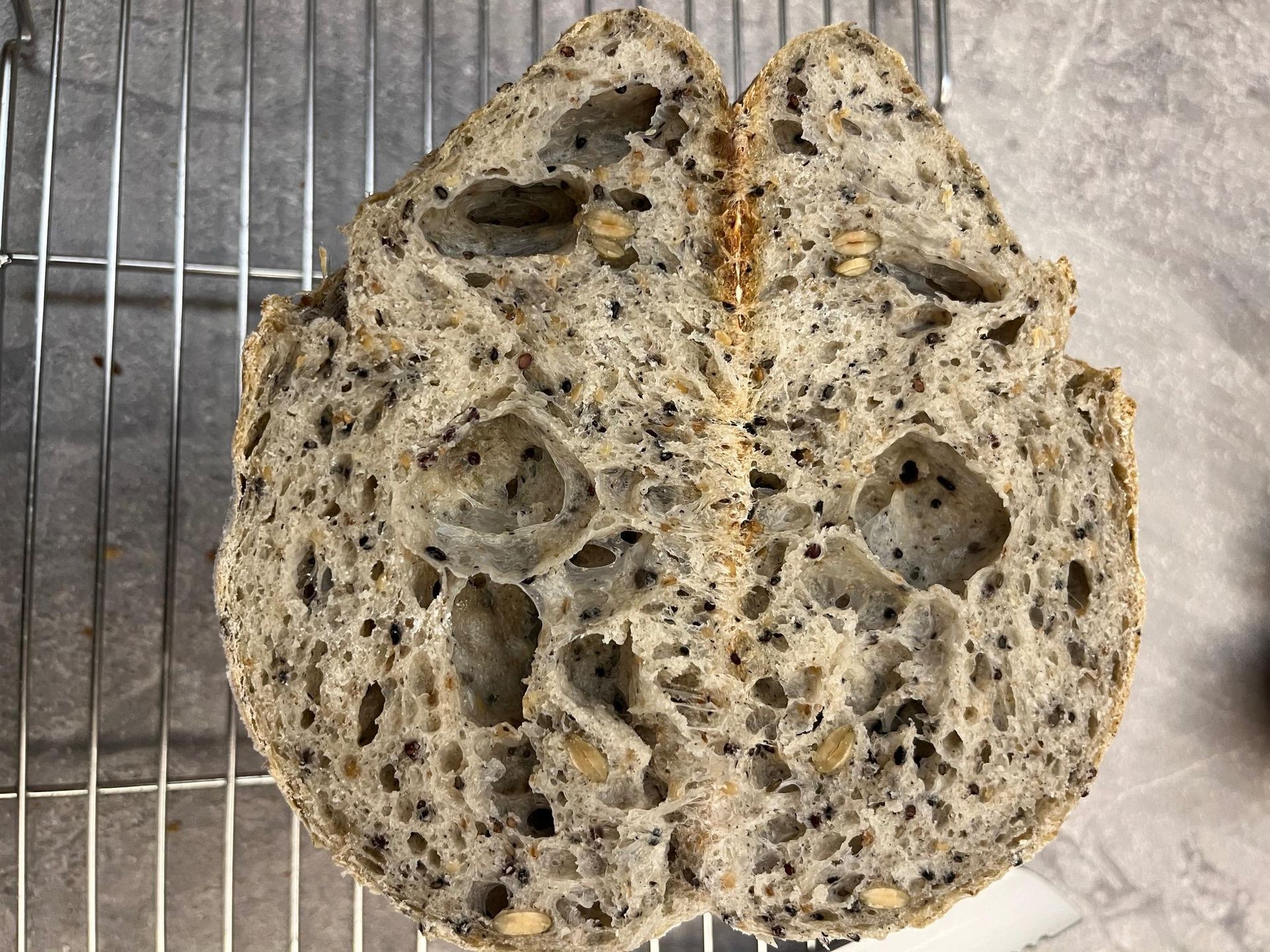 前2.5小時前cf/sf三次麵團狀況良好雖然黏但有繃住的感覺,5個小時毛毛蟲試驗浮出水面1/4,但整型後就不太對勁,最終麵包620g 燒減率8%,沒有期待的輕盈感有點沉,吃起來有一點點黏,下次再加油