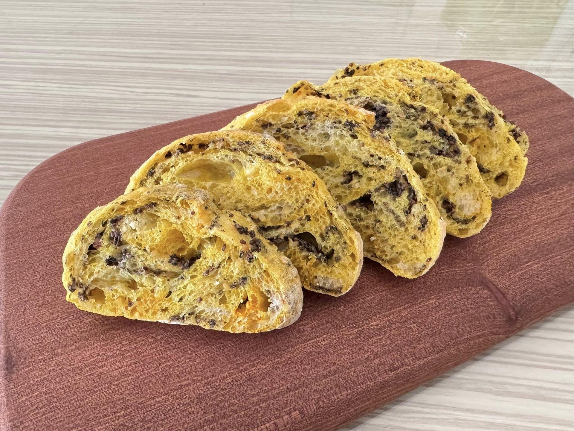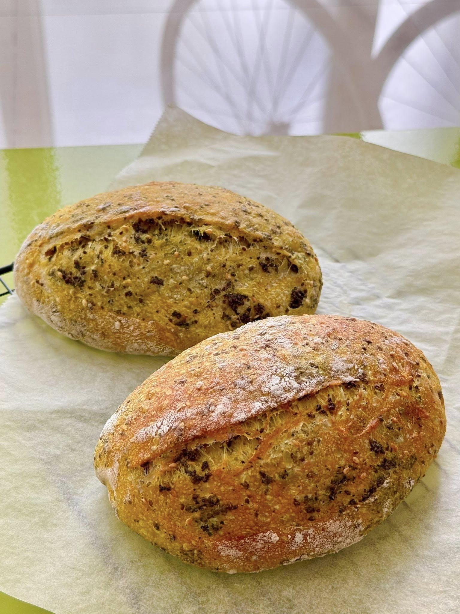 感謝咖啡店老闆割愛給我半瓶有機薑黃粉,於是加入多種子酸種麵包 的食譜中,順便多練習