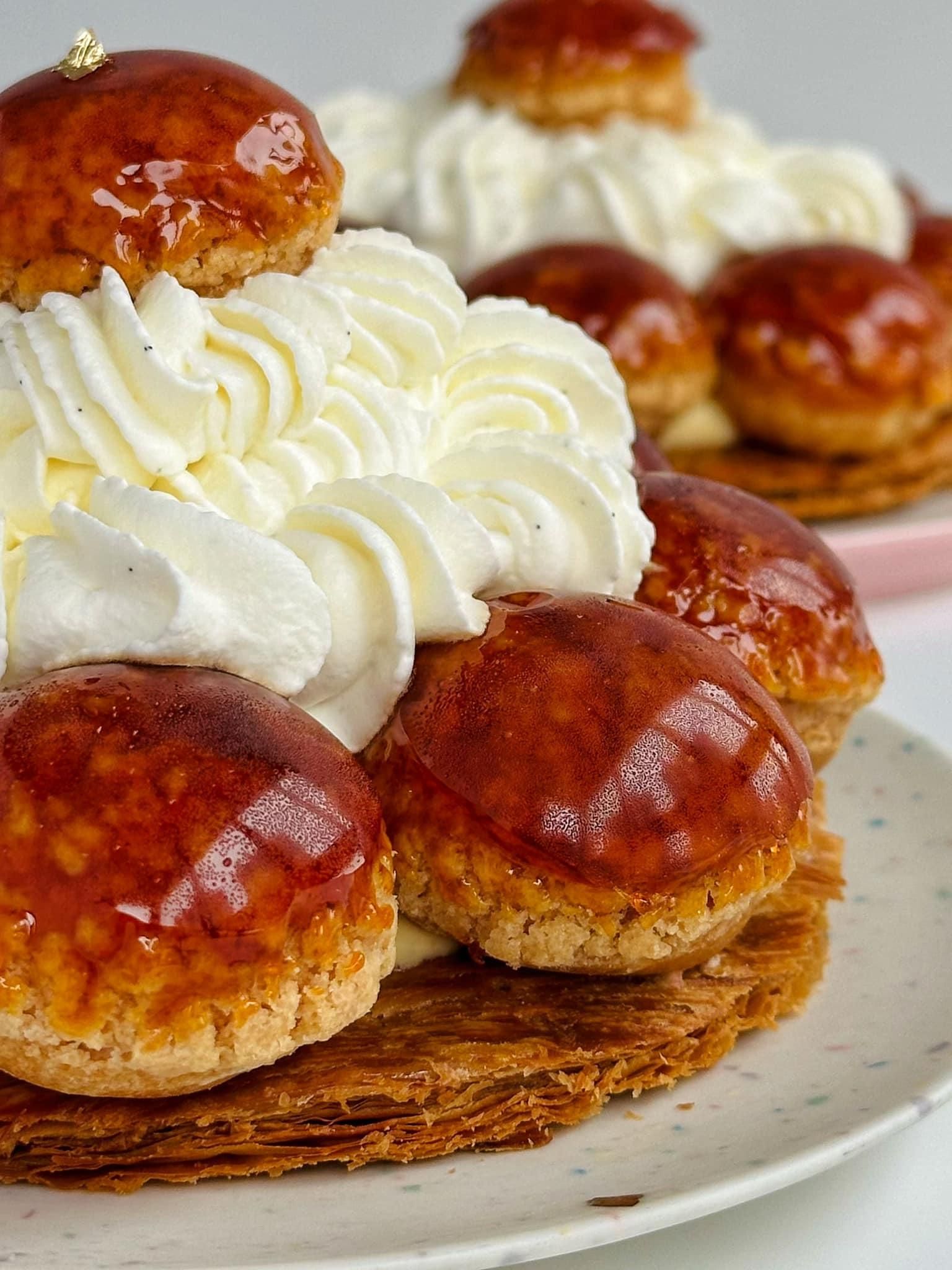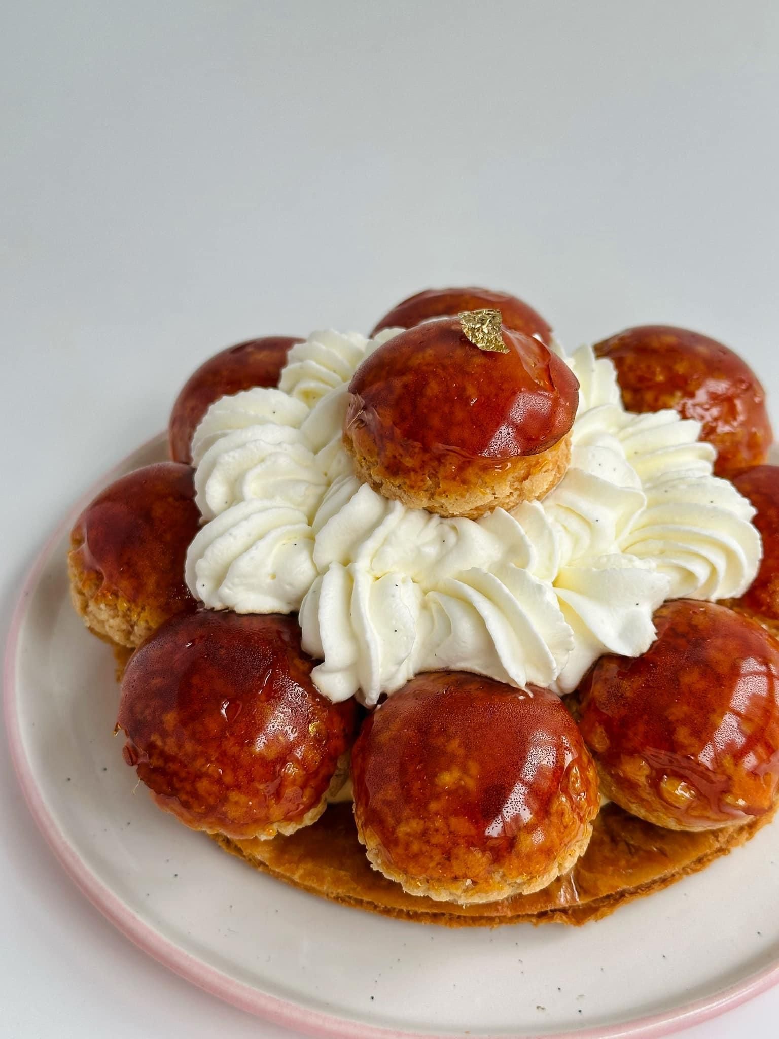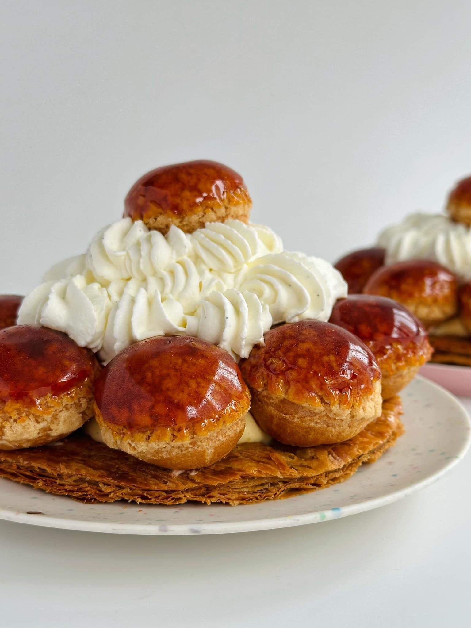 Tim老師吳ㄧ無二課程的經典聖多諾黑,千層麵粉比例真的很厲害,反折千層的那個酥脆口感吃到有驚艷,再加上詳細的烘烤時間,這次烘烤出來非常滿意!另外就是泡芙的焦糖,之前在做的時候並沒有加葡萄糖,每次做就是一個跟時間賽跑很怕凝固,使用老師的配方後完美解決這個問題,做了那麼多次解決蠻多的問題!唯一就是泡芙的作法,真的不太習慣,第一次直接失敗⋯⋯還是習慣炒過麵糊~